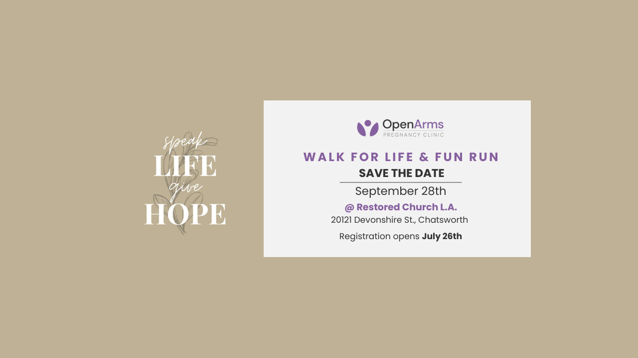 The Walk for Life and Fun Run is a peaceful, positive event giving people a way to apply their pro-life convictions, raise support, and increase awareness in our community. Come support Open Arms Pregnancy Clinic and the wonderful work they do! A burger lunch is available for $7 at the event. Click here to register